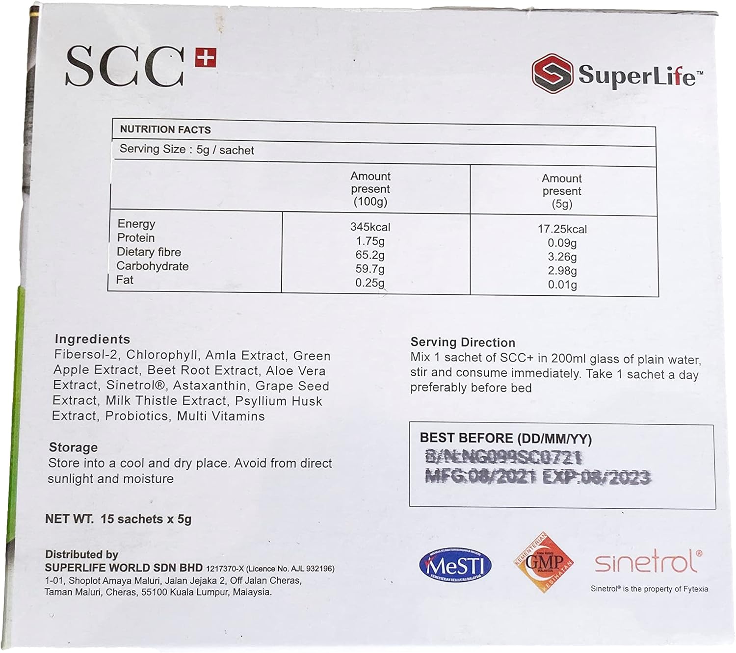 SCC+ (SCC15 Newly Improved) Superlife Colon Care is a product designed to enhance the health of your colon, support liver detoxification, and aid in weight loss. With its unique formula, it aims to promote a healthy gut and prevent the reabsorption of waste into the bloodstream.